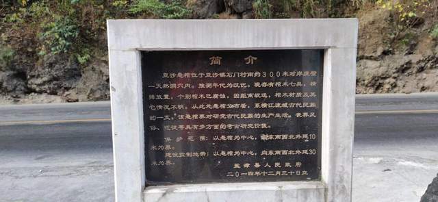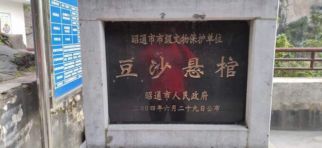 盐津县人民政府二0一四年十二月三十日所立碑文显示:豆沙悬棺位于豆沙镇石门村南约300米对岸崖壁一天然洞穴内。推测年代为汉代。现存有棺木七具,横排放置,个别棺木已腐蚀,因距离较远,棺木材质及其它情况不明。从此处悬棺分布看,系横江流域古代民族的一支。该悬棺葬对研究古代民族的生产生活。丧葬风俗、迁徙等具有多方面的考古研究价值。