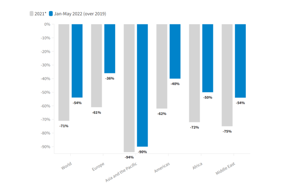 根据UNWTO发布的最新世界旅游晴雨表,国际旅游业在2022年前五个月出现了强劲反弹,有将近2.5亿的国际游客出行,是去年同期的3倍多(221%)。