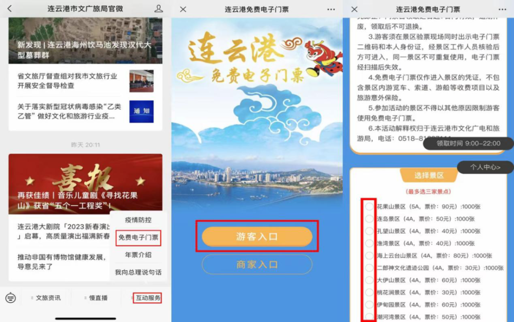 免费电子门票是面对全国游客发放的连云港市域内4A级(含)以上国有收费景区的免费进入电子凭证,游客凭本人身份证号码在“连云港市文广旅局”官方微信公众号免费申领,先到先得,领完即止。