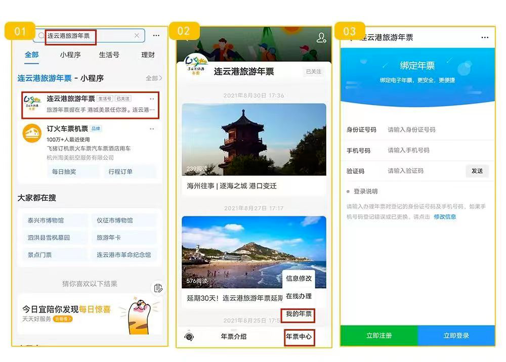 2.“连云港旅游年票”支付宝生活号,菜单栏“年票中心”在线办理。