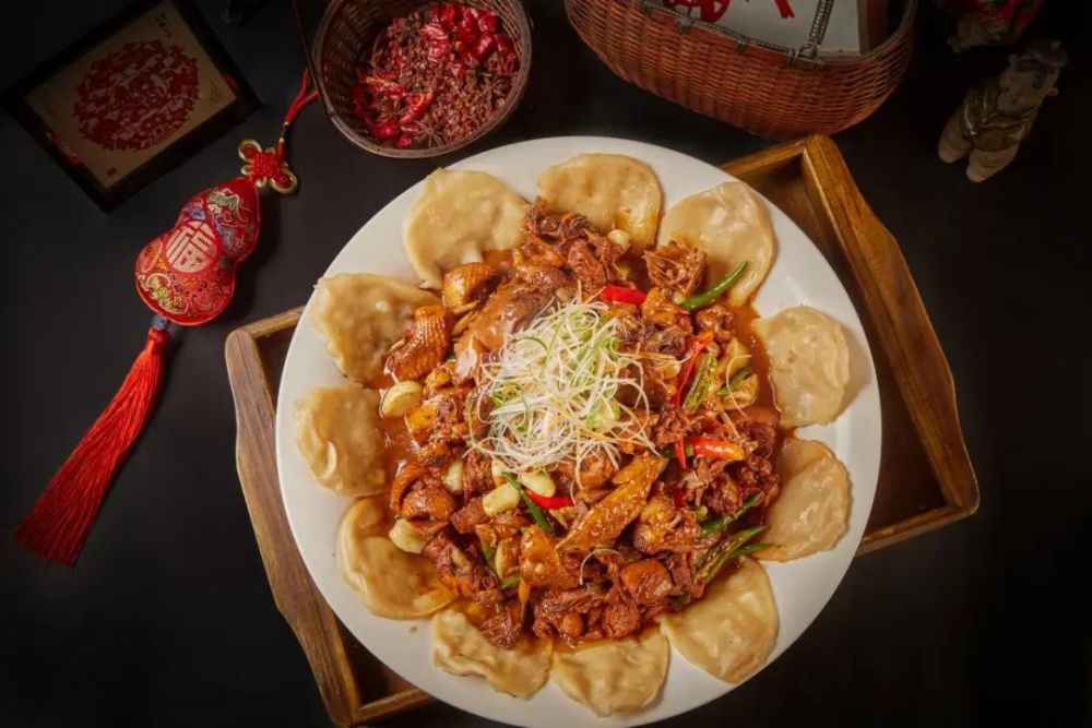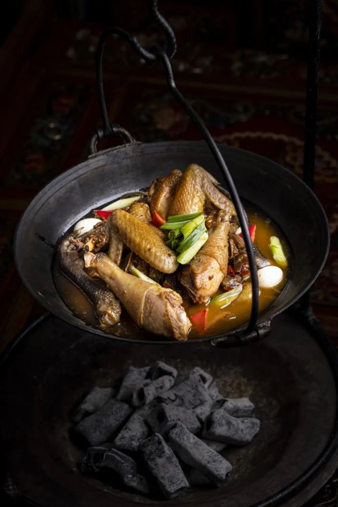 安徽淮北,榴园地锅鸡是万家飘香的特色农家菜,当揭开锅盖的那一刻,食欲瞬间被勾起,鲜浓的汤汁包裹着鸡肉,锅周边贴着色泽诱人的薄饼,有肉有汤有面饼,面饼上端焦酥、下端吸满汤汁,吃上一口香滑的鸡肉,不禁感慨。榴园地锅鸡的汤汁较少,口味鲜醇,饼借菜味,菜借饼香,具有软滑与干香并存的特点。