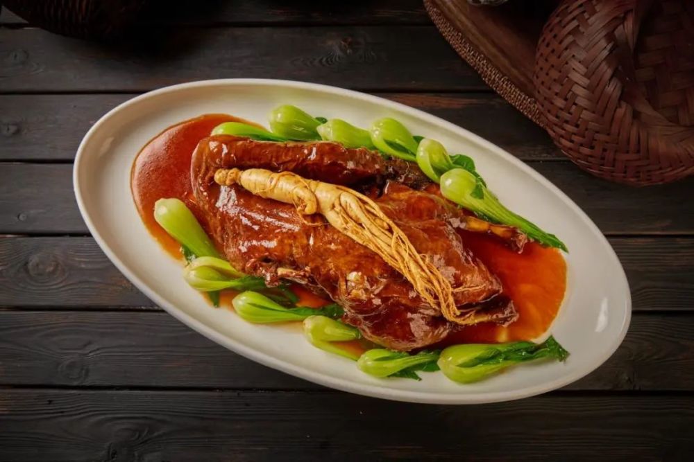 亳州地处涡河两岸,水系众多,养殖的鸭子也不少,华祖焖鸭这道药膳精选红嘴麻鸭,也有的选用番鸭,烹饪的方式主要是红焖,辅以巴戟、杜仲、车前子等十六味中药材焖制而成。小火慢炖一个半小时左右,焖出来的鸭子色泽红润、香味四溢,尝上一口,鸭肉香酥软烂,打开以后既有中药材的香味,又有鸭子的肉香。