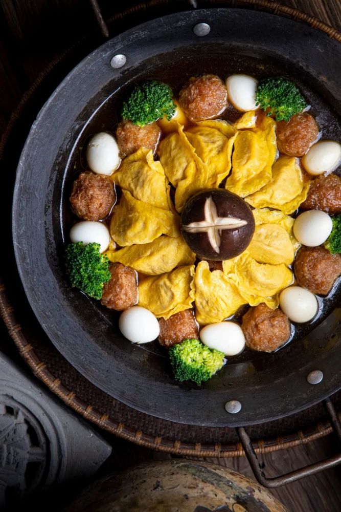 一口铁锅里,萝卜、干豆角、红烧肉、油豆腐包等食材按照先素后荤次序,一层层铺于锅里,烧熟后端上桌来,这些层层叠叠的食材相互渗透,香气四溢!食材越丰富,层数越多,有五层,有七层,最多可达九层,用柴火灶慢慢煨炖两三个小时。这道铁锅菜便是徽州名菜——胡适一品锅。