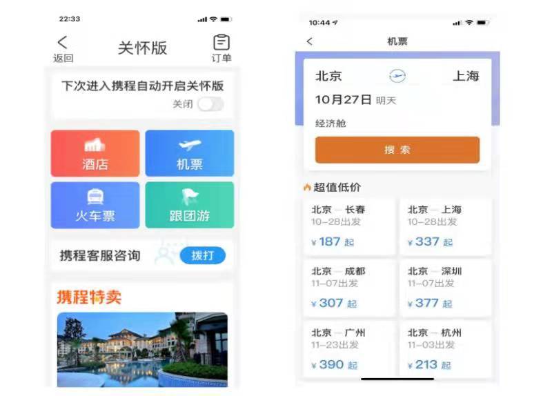 据携程相关负责人介绍,携程App“关怀版”内容涵盖酒店、机票、火车票、跟团游等主要旅行类型。为方便老年用户阅读,关怀版的字体大,对比度高。同时,将客服咨询板块放于主页面,只需轻轻一点,就能接通专属客服电话,根据老年人需求提供旅行咨询、代为预订等服务,这使得老年用户获取客服咨询的方式更加便捷。