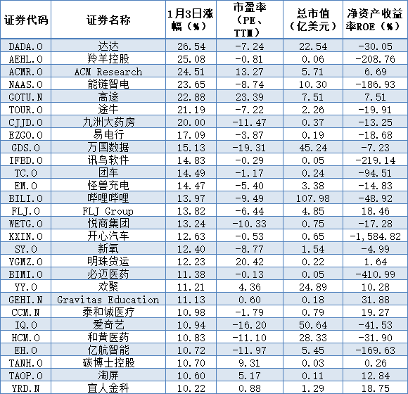 值得关注的是,在美股走低之际,中概股逆势走高,截至1月3日收盘,纳斯达克中国金龙指数涨3.76%,直播概念、网络视频、在线旅游等概念领涨,途牛涨幅21.19%,哔哩哔哩、欢聚、爱奇艺涨幅超10%。记者通过梳理各大机构研报以及对专家采访发现,三方面因素推动中概股走强: