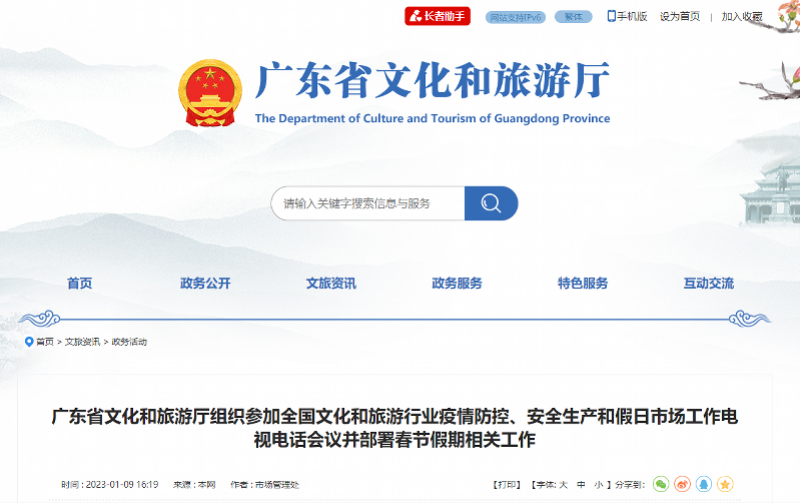 9日下午,广东省文化和旅游厅官网发布《广东省文化和旅游厅组织参加全国文化和旅游行业疫情防控、安全生产和假日市场工作电视电话会议并部署春节假期相关工作》,其中表示,文化和旅游部召开全国文化和旅游行业疫情防控、安全生产和假日市场工作电视电话会议,文化和旅游部党组书记、部长胡和平出席会议并讲话,文化和旅游部党组成员、副部长杜江主持会议。广东省文化和旅游厅党组书记、厅长李斌在会上作了交流发言。厅党组成员、副厅长赵红、曾晓峰,二级巡视员陈贵杰、李再炎等领导在广东分会场参加会议。