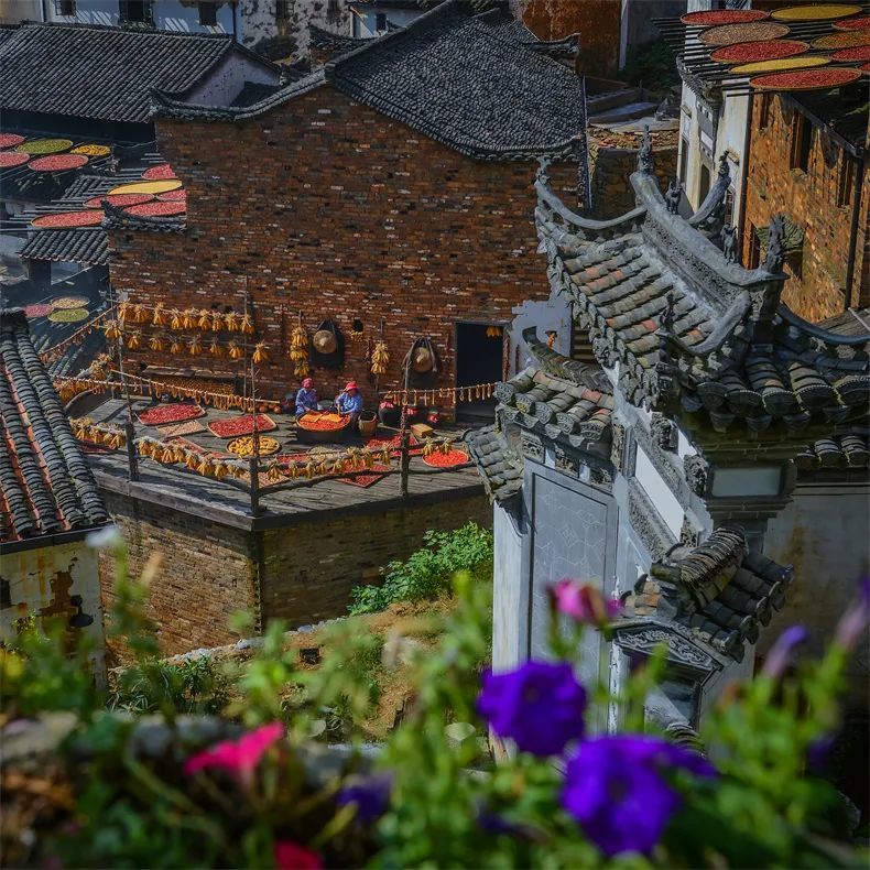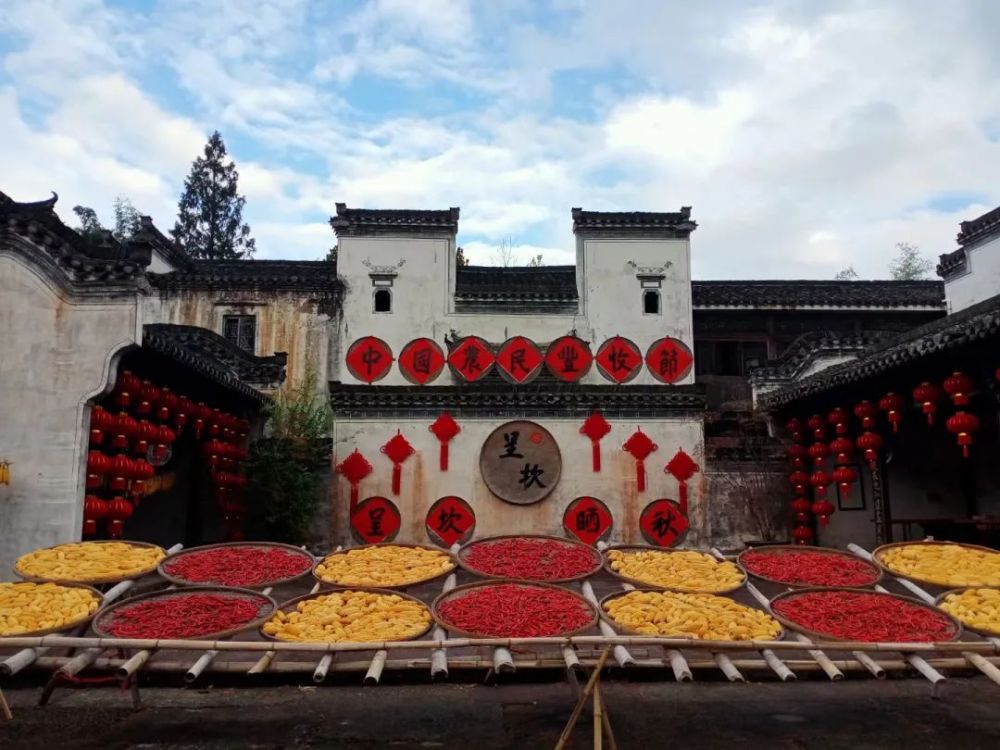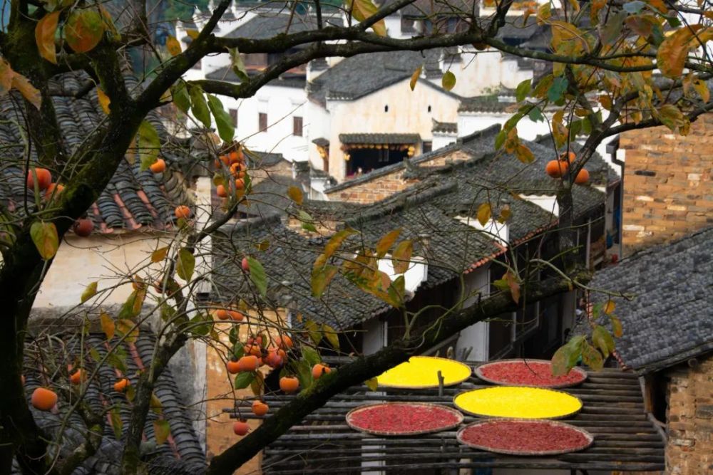 秋季也是这里最美的时节,行走于徽派建筑的巷陌之间,火红的辣椒、金黄的玉米、橘红的南瓜片,竹竿架上成串的灯笼柿也........