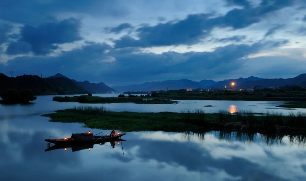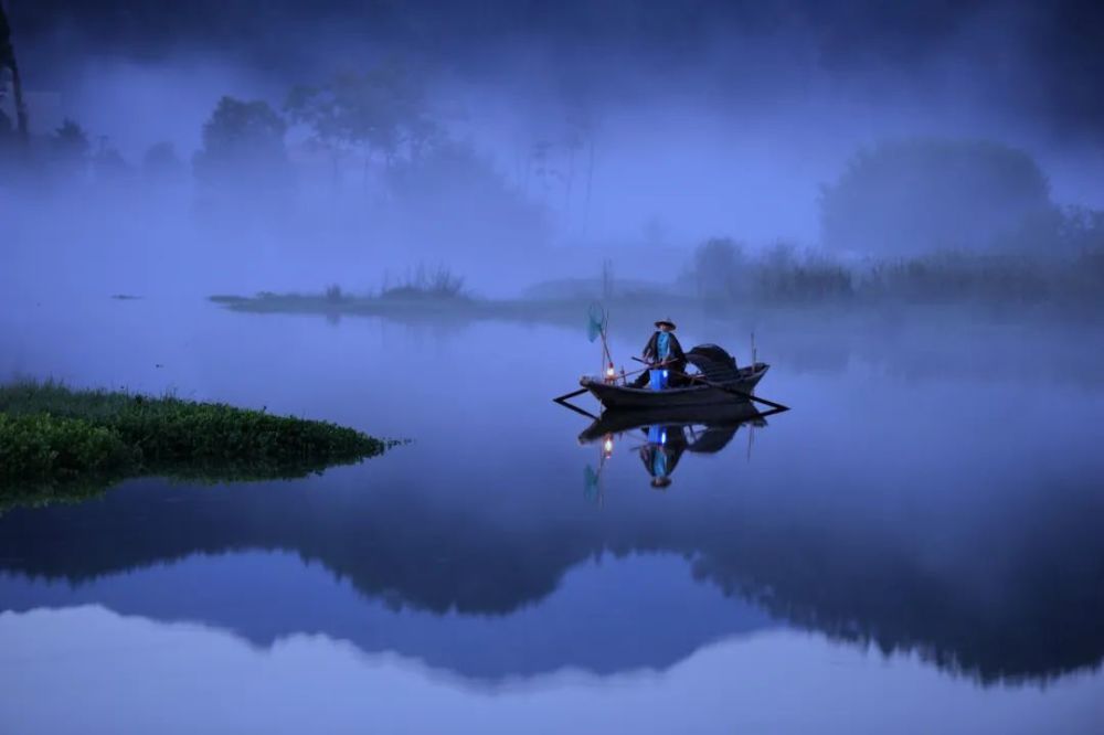 秋日的桃花潭畔,天高云淡,碧波澄澈。渔夫们划着一叶摇船,慢悠悠地荡漾其中,浅灰的山色摇曳空濛,让人一时间竟分不清人间或是仙境。