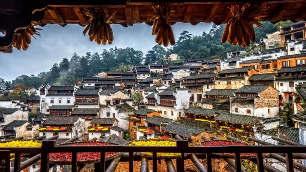 婺源最美的还是晒秋,家家户户窗台放着的簸箕、辣椒、地瓜、玉米、柿子,站在村子高处往下看,好一幅五颜六色的人间秋景图。