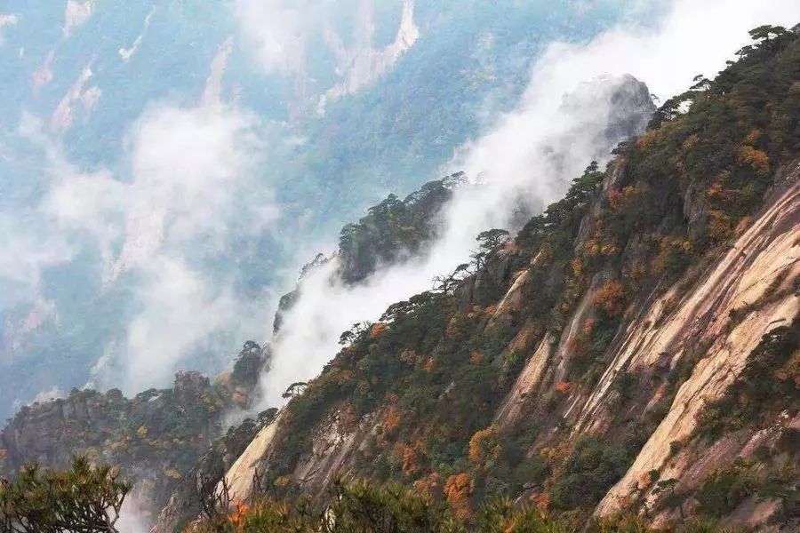 9月中旬以后,黄山的树叶开始褪去层层翠绿,逐渐变成金黄、火红;到了10月后,秋色开始变浓了,从黄山峰巅而下一寸一寸蔓延开来,最是绚烂。