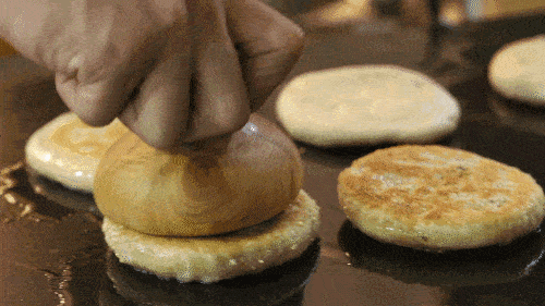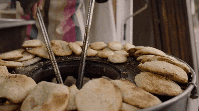 圆圆的,小小的,色泽金黄如同蟹壳,又叫蟹壳烧饼,一口一个,满口焦香。