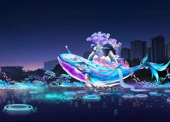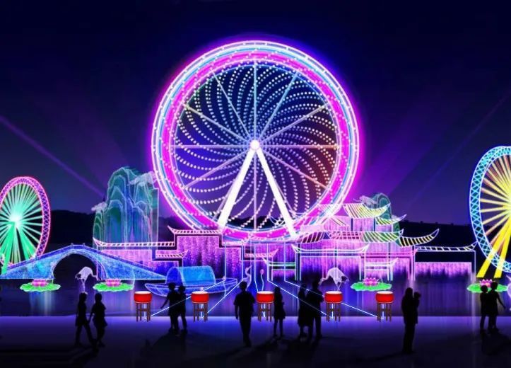 此外,更有鲲鹏越海、光影摩天轮等大型水面灯组,流光溢彩,与湖面交相辉映。