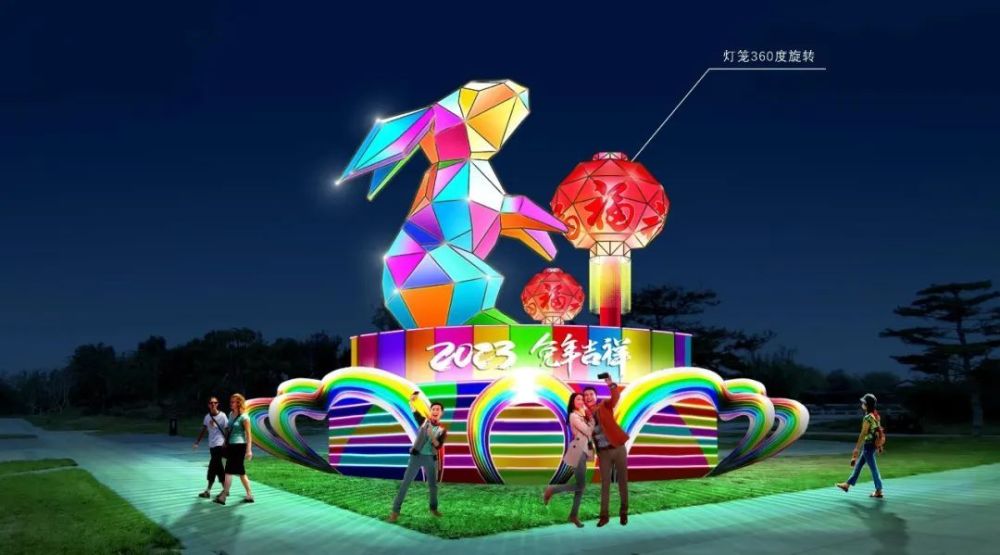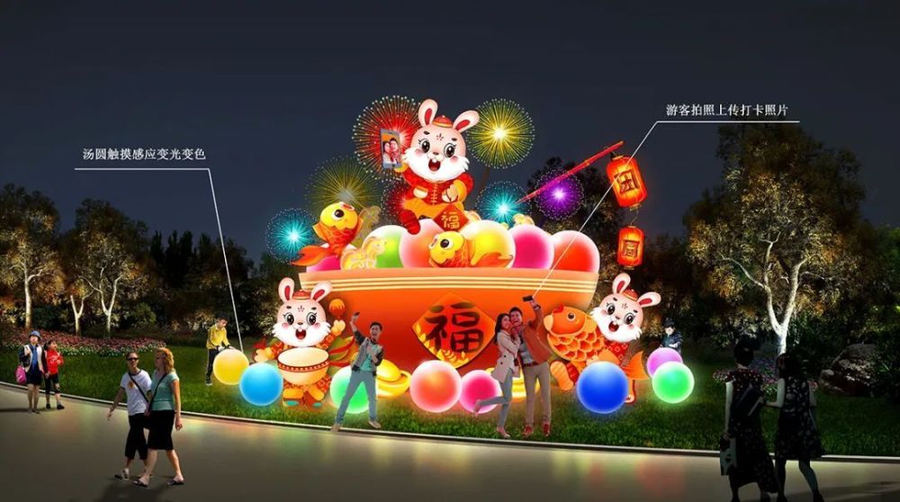 兔年当然少不了萌兔灯组。乖乖兔手拿吉祥灯笼,把兔年的新年祝福传递给来往的每个游客朋友。也可以和福兔灯组互动打卡,留下自己美美的自拍。