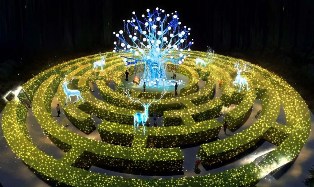 谜园设有能量迷宫互动灯组,游客进入后,神树老人用低沉的声音讲述樱花女神留下“樱花种子”的故事,游客朋友们可以前往迷宫中心探秘。
