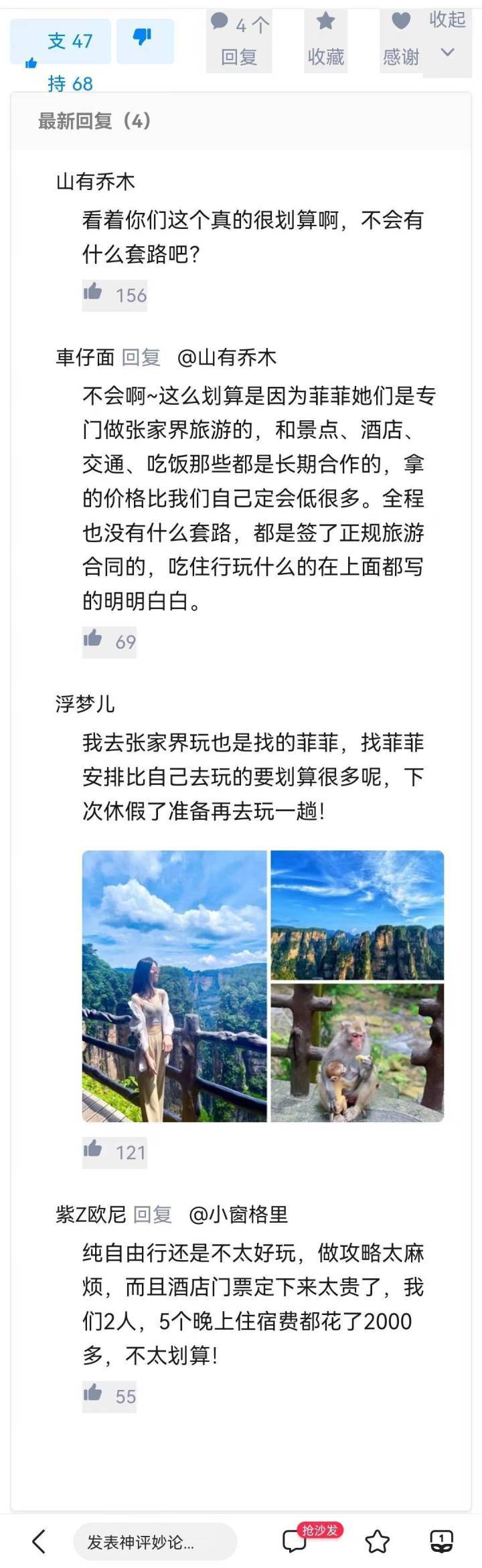 全程5天4晚张家界景点门票、交通、司机、导服费、吃饭等方面性价比各方面都很高。菲菲是张家界当地专业行程规划导游,全程为我们行程策划,我自己完全没操一点心,整个人都是一个轻松的状态在玩;回来跟朋友聊起来才知道真的避了很多坑啊哈哈。