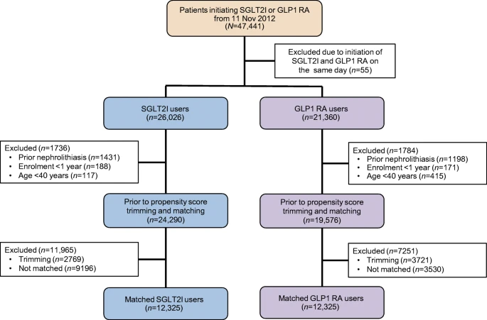 我们确定了从 2012 年 11 月 11 日(欧洲首个 SGLT2I 获批日期)到 2018 年 12 月 31 日期间开始 SGLT2I 或 GLP1 RA 治疗的所有丹麦人 [ 13 ]。符合条件的个体在开始研究药物时年龄在 40 岁或以上,在进入研究之前的任何时间都没有开过任何 SGLT2Is 或 GLP1 RA 的处方,在队列进入之前在丹麦连续居住了至少 1 年,并且没有有肾结石病史(ESM 图1)。在队列进入之日同时开具 SGLT2I 和 GLP1 RA 处方的个体被排除在外。