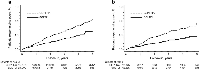 图 2SGLT2I 和 GLP1 RA 用户的不匹配 ( a ) 和倾向评分匹配队列 ( b ) 中肾结石的 5 年累积发病率图