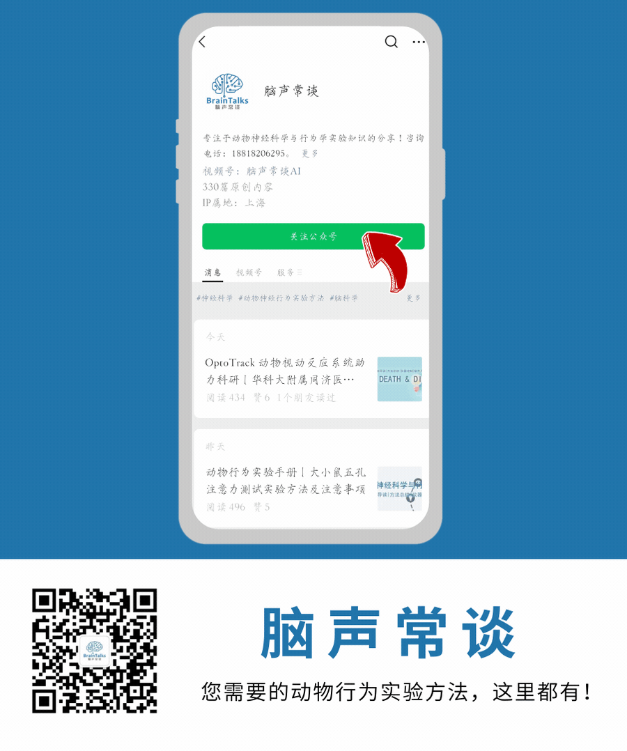 如果您对T迷宫实验感兴趣,可以继续关注我们脑声常谈下一期:动物行为实验指南|T迷宫用于评估空间工作记忆的行为学测试方法总结(2),《动物行为实验指南》正在陆续发表,后期会印刷成册,免费包邮赠送给关注我们公众号1年以上的粉丝!目前,《动物行为实验手册》印刷版正在免费发放,欢迎推荐关注脑声常谈!