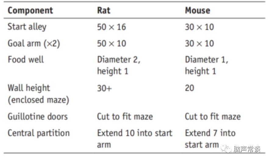 表1:T迷宫尺寸(长度×宽度)汇总。所有的单位都是厘米