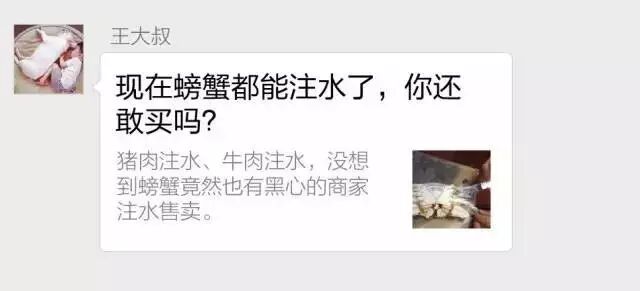 真相:所谓的“注水螃蟹”其实是一则流传多年的谣言,早已被多地工商部门锁定为虚假消息。蟹类产品甲壳内的组织吸水性很差,如果注入液体,螃蟹体内环境渗透压会产生剧变,脏器要么失水要么吸水,都会导致螃蟹在十几分钟内迅速死亡。死螃蟹价格是活螃蟹的五分之一,蟹农要干注水这事还不得亏死。