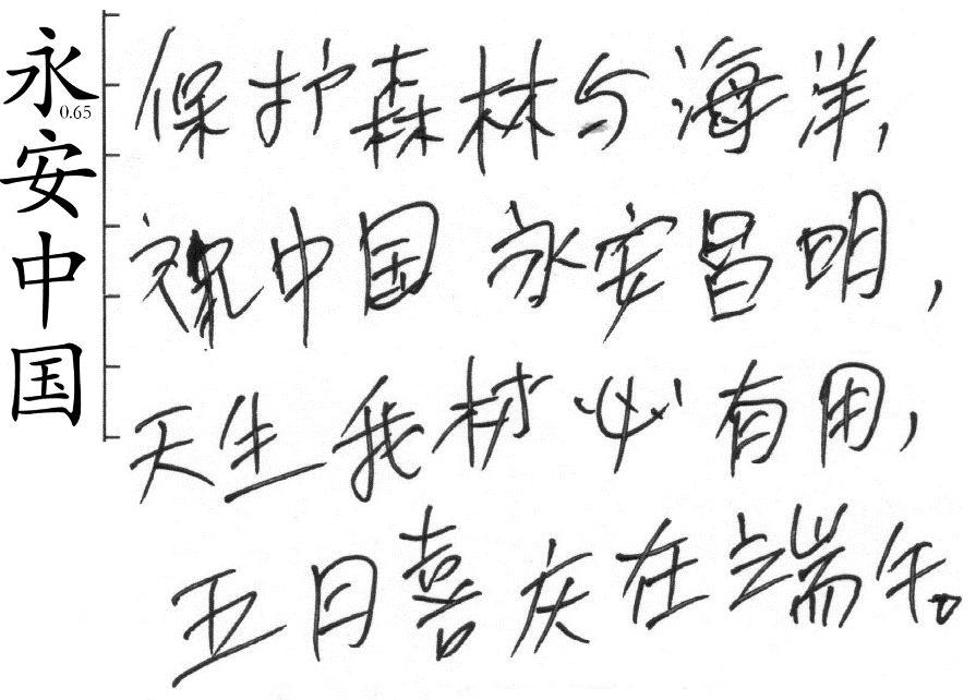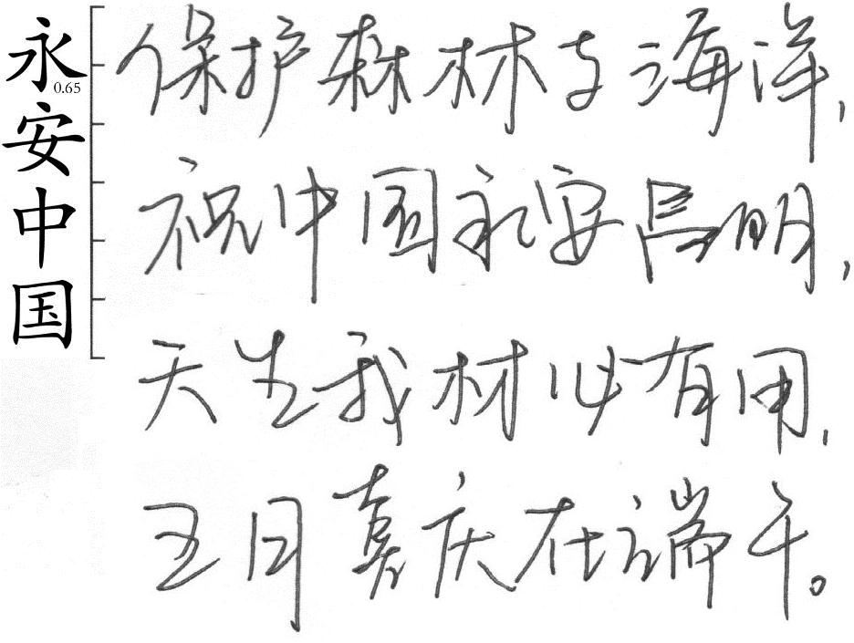 人际融合能力:线条转折为圆角。感知力:笔迹线条形态丰富,轻重快慢都有。 (3)笔迹案例: