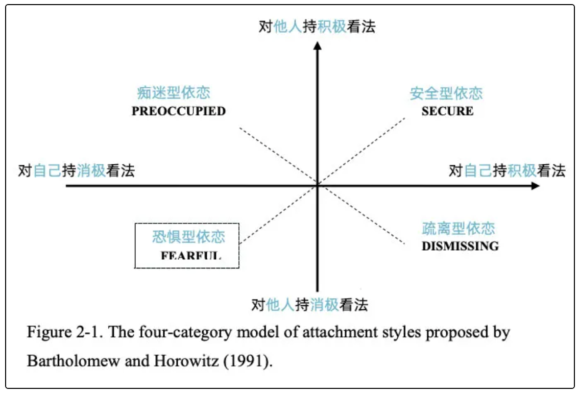 ta渴望亲密,希望能接近潜在的依恋对象(朋友/伴侣)。但当那些人靠得太近,ta们会变得非常不舒服,并渴望退出这段关系。然而,觉察到对方离开,ta又变得焦虑,肝肠寸断。因此,ta传达给别人的信息其实是:“我喜欢你,但你离我远点”。1991年,心理学家Bartholomew等人提出,成年人的依恋关系,大致存在4种类型:安全型(secure)、恐惧型(fearful)、疏离型(dismissing),痴迷型(preoccupied)。