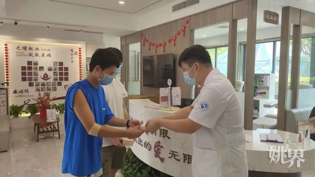 十多分钟后,三位年轻人陆续完成了献血,工作人员还细心地叮嘱他们注意饮食,避免剧烈运动等。随后,工作人员给他们送上了刻有“致青春,献热血”字样的十八周岁专属献血纪念章。他们说这枚纪念章是最好的十八岁成人礼。
