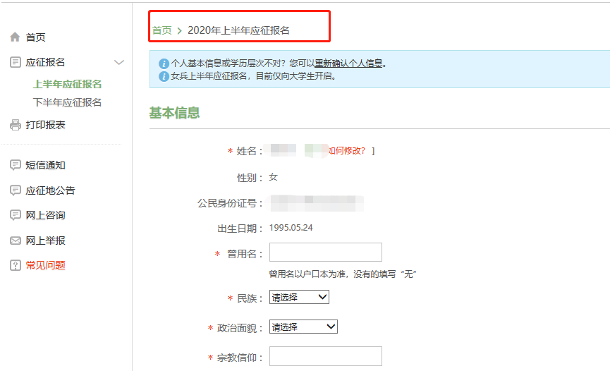 以女兵应征报名为例,会出现以上窗口,点击“我已阅读报名须知”,这里会详细介绍男兵和女兵的应征报名须知,建议详细阅读,了解征兵条件。接下来,正式进入应征报名个人信息填写。姓名、身份证号码等系统会自动填上,大家只需填上民族、宗教信仰、政治面貌、家庭住址、联系方式等等,大家如实填写即可。务必看清自己报的是上半年还是下半年,千万别弄错了。
