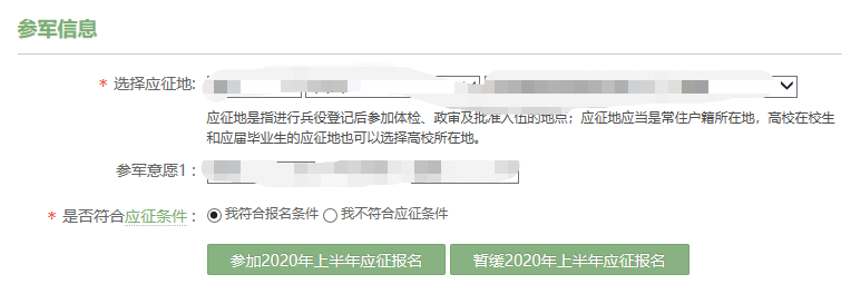 2、进行兵役登记时可同时申请2020年义务兵应征报名,如今年无参军入伍意向,兵役登记时可选择“只进行兵役登记,申请2020年度缓征”。