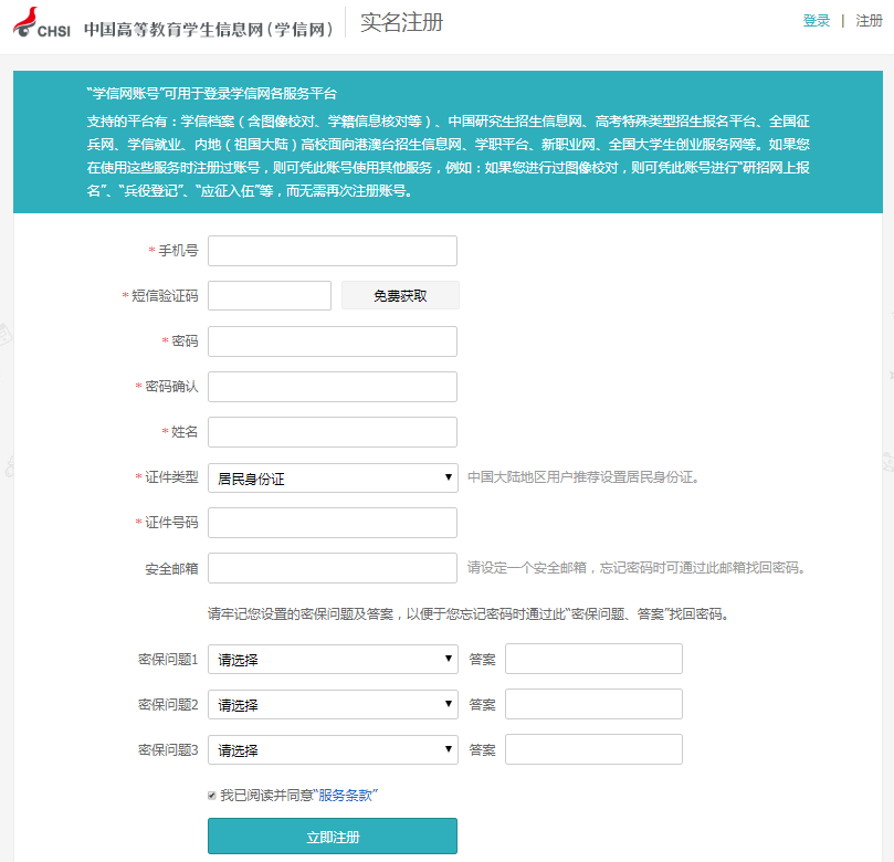 注册学信网账号必须实名,一定要用真实姓名和身份证认真填写,兵役机关将对有效信息进行审核。进行注册时,手机号即是账号,请牢记账号、密码。填写后,点击“立即注册” 。