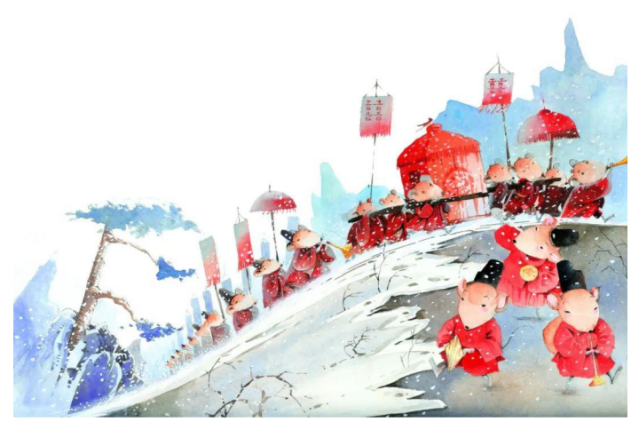 轿子是由四肢老鼠晃晃悠悠地抬着,走在宋亲队伍的最前面。送亲的老鼠都前呼后拥,只听见锣鼓喧天,唢呐欢唱,好不热闹!
