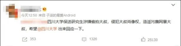 9日,“大叔被疑偷拍自证清白后仍遭女子曝光”话题冲上热搜,引发网友热议。有网友爆料称,涉事女子为四川大学新闻学院研究生。对此,四川大学研究生院研工部回应称,此事已经在调查,具体情况等待稍后的官方通知。广州地铁工作人员回应,当时警方已介入处理,因为是误会,双方当时已经和解。据@沸点视频 报道,6月7日,广东广州地铁8号线上,女子看见一大叔蹲着玩手机,怀疑对方是偷拍自己,要求检查相册,大叔让她检查自证清白。发现相册中并没有偷拍照片之后,该女子仍旧对大叔说“小心一点,不要乱拍别人”。此后,该女子在网络曝光大叔是“猥琐男”,称其手法娴熟不是第一次作案,她还称“难道我的权益没有受到侵害我就不用去维权了吗”“非要等发生什么我才能说什么吗?”她表示,既然没有偷拍,那他为什么不为自己发声。图自社交平台该女子的做法引发质疑,不少网友认为该女子应该向大叔道歉,“想维护自身利益可以理解,但发现误会别人了,为什么不道歉?”“希望大叔能拿起法律武器维权”。