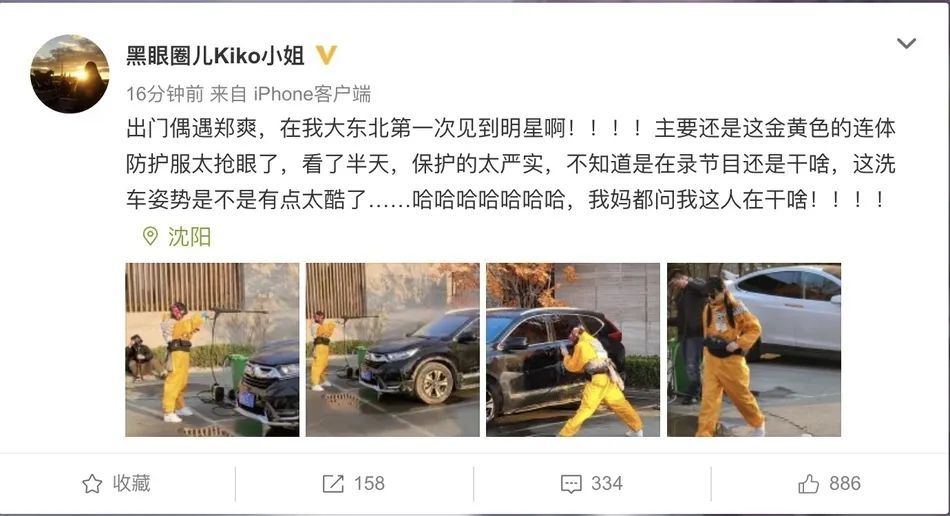 10日,网友在微博晒出偶遇郑爽洗车的图片。照片中郑爽以双马尾造型搭配黄色连体防护服,戴上墨镜化身酷girl在线洗车。