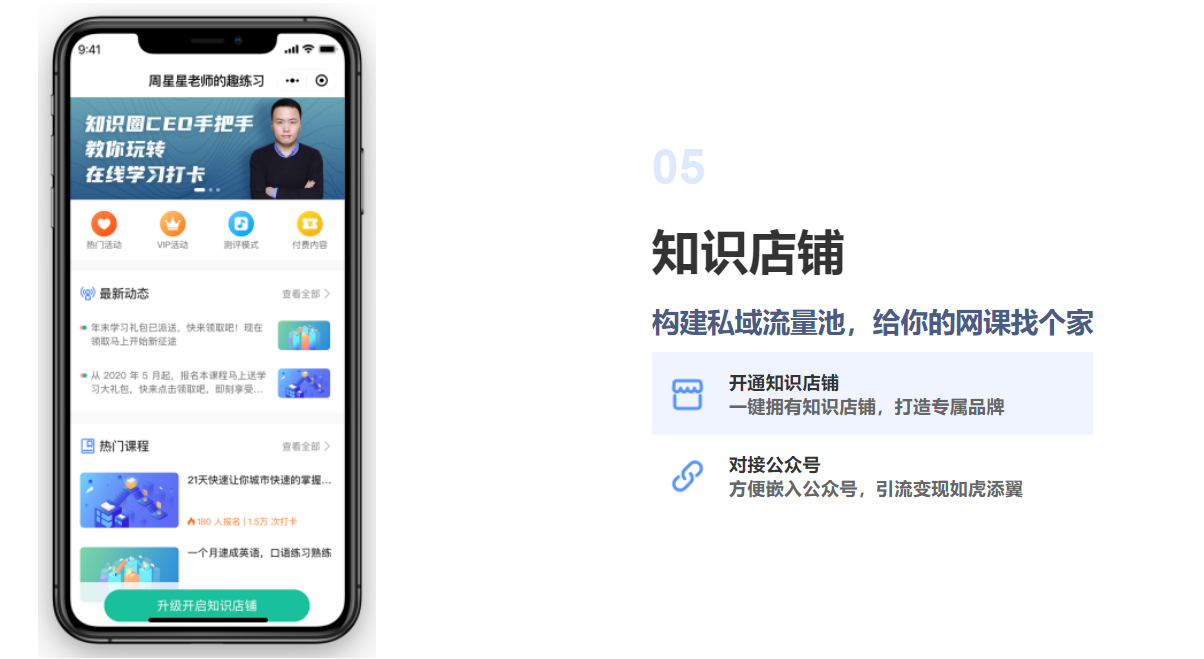 04 品牌IP打造:老师们可以利用趣练习的知识店铺,打造个人IP,知识店铺支持自定义设置、嵌入公众号,快速实现引流变现