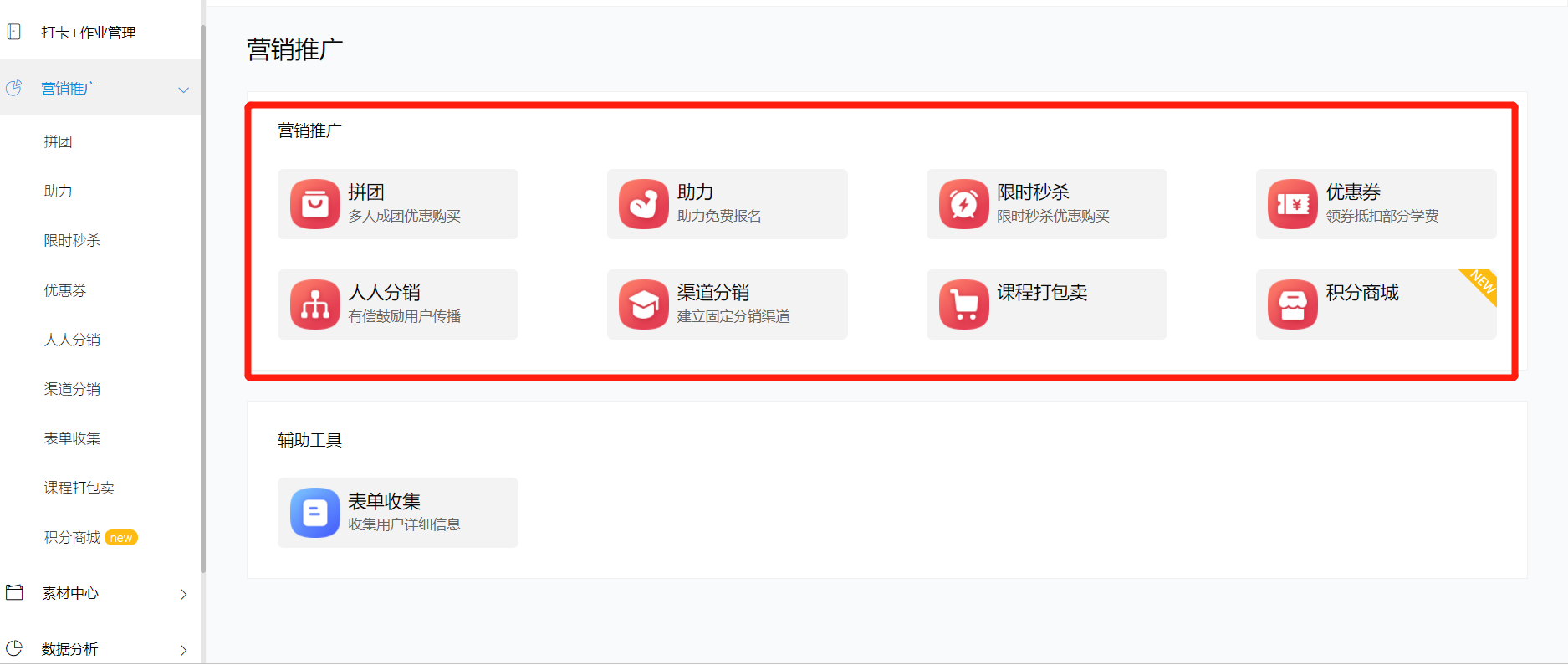 05 营销招生:作为中小培训机构,招生获客难是一大痛点,趣练习拥有丰富的营销工具,优惠券、拼团、秒杀、助力、人人分销、渠道分销、积分商城等等,可以完美配合老师们的招生方案