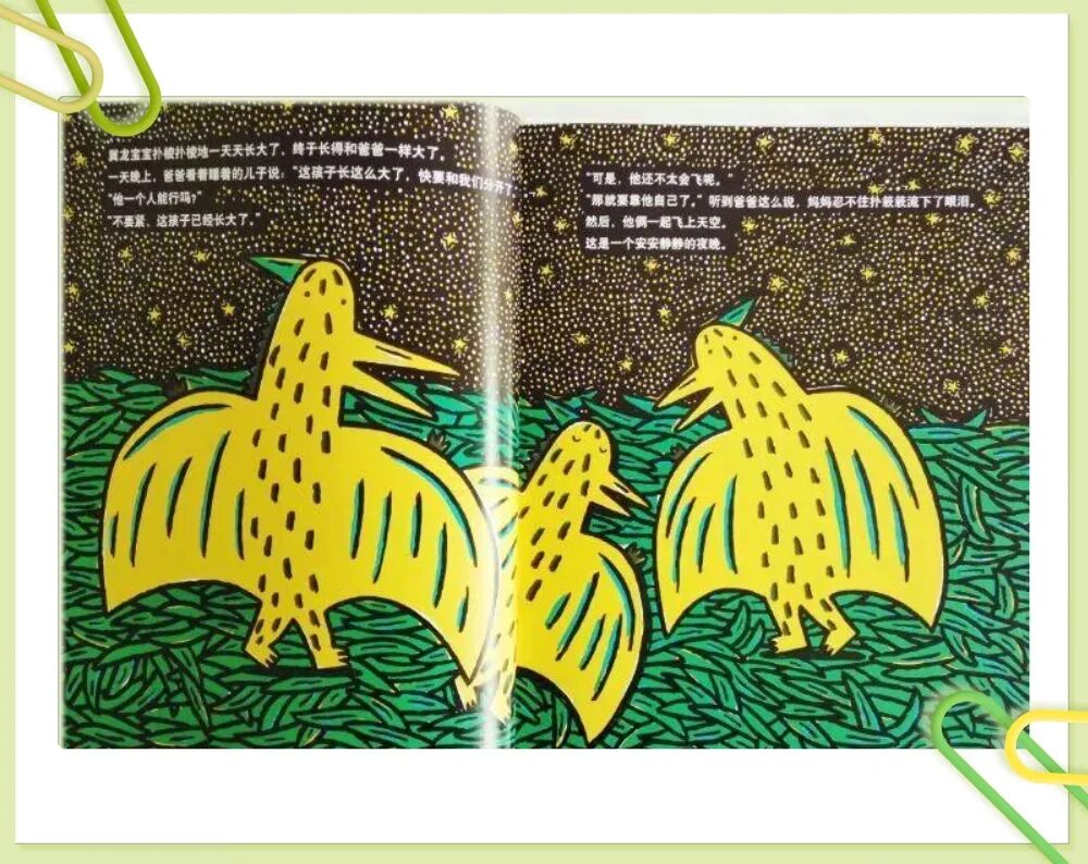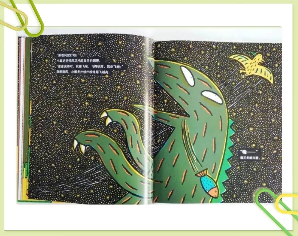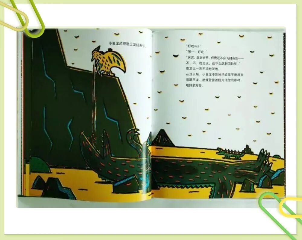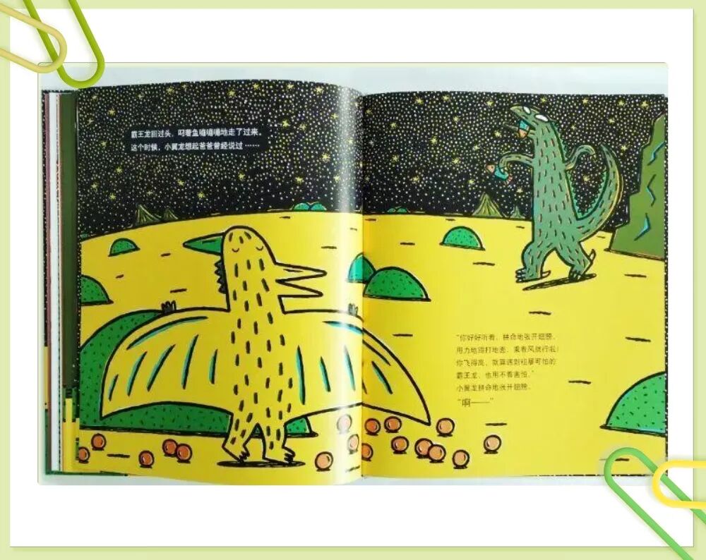 爸爸教他怎么飞行:“你好好听着,拼命地张开翅膀,用力踢打地面,乘着风就行啦!只要你飞得高,就算遇到粗暴的可怕的霸王龙,也用不着害怕。”