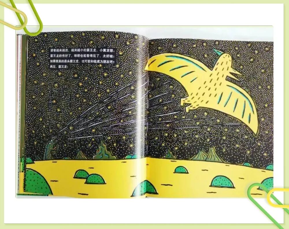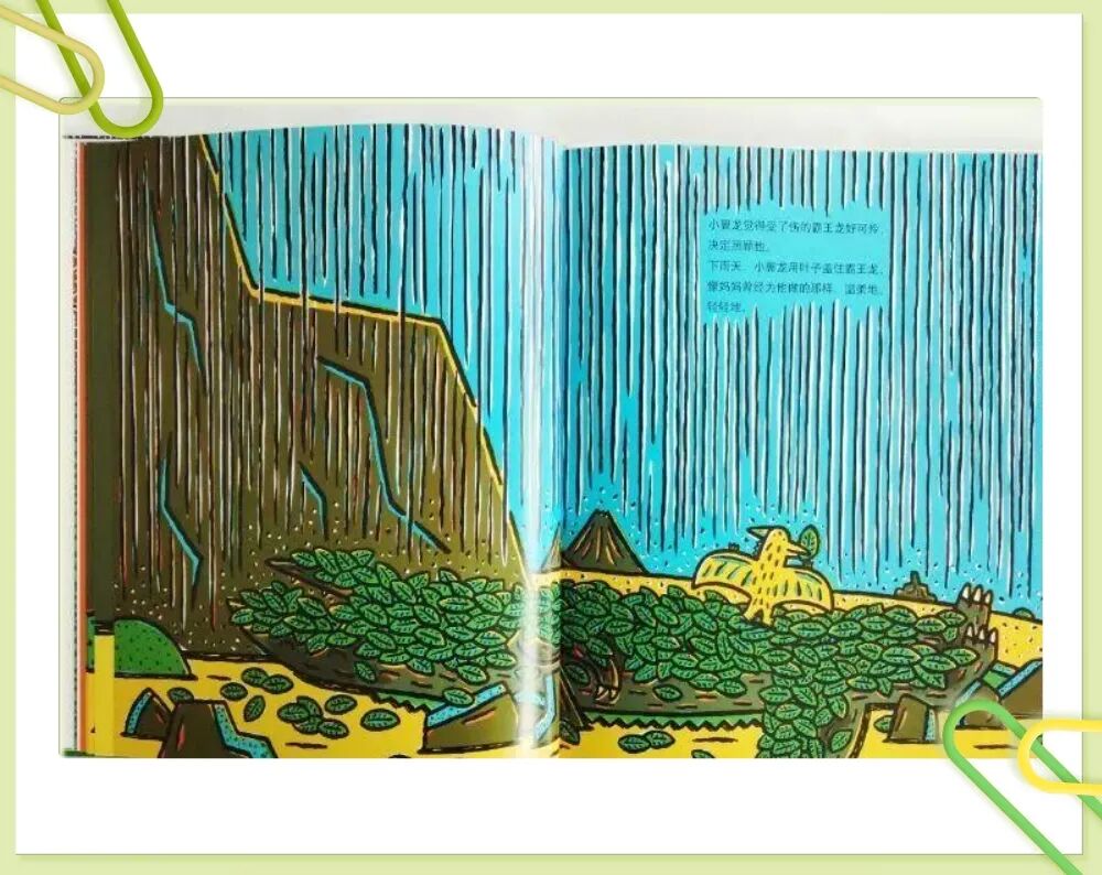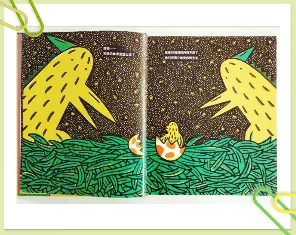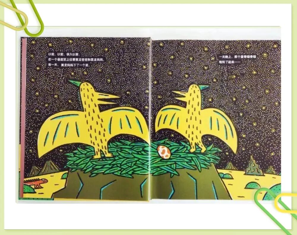 爸爸教他怎么飞行:“你好好听着,拼命地张开翅膀,用力踢打地面,乘着风就行啦!只要你飞得高,就算遇到粗暴的可怕的霸王龙,也用不着害怕。”