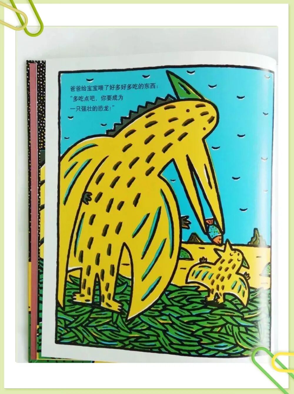 爸爸给宝宝喂了好多好吃的东西。“多吃点吧,你要成为一只强壮的恐龙!”