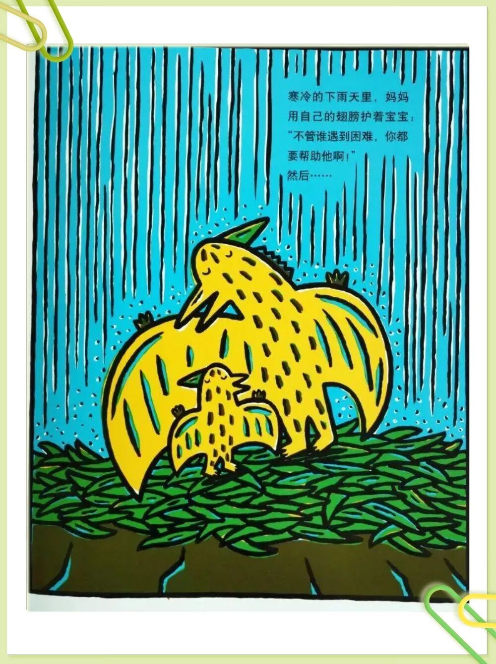 寒冷的下雨天里,妈妈用自己的翅膀护着宝宝:“不管谁遇到困难,你都要帮助他啊!”