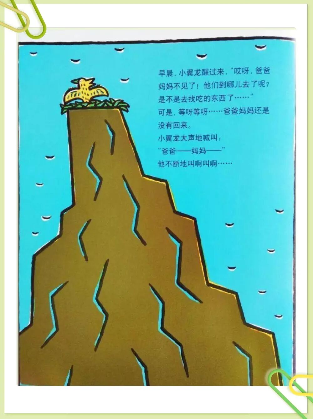 早晨,小翼龙醒过来,“哎呀,爸爸妈妈不见了!他们到哪儿去了呢?是不是去找吃的东西了......”