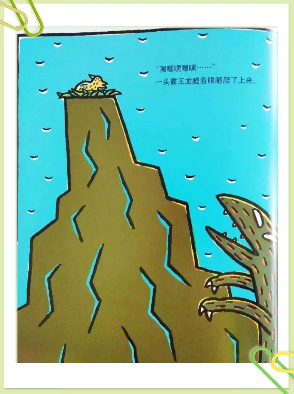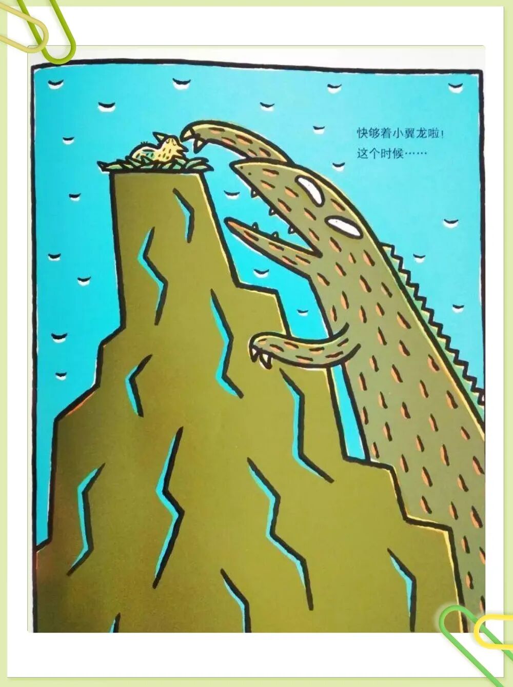 “你好好听着,拼命地张开翅膀,用力踢打地面,乘着风就行啦!你飞得高,就算遇到粗暴的霸王龙,也不用着害怕。”