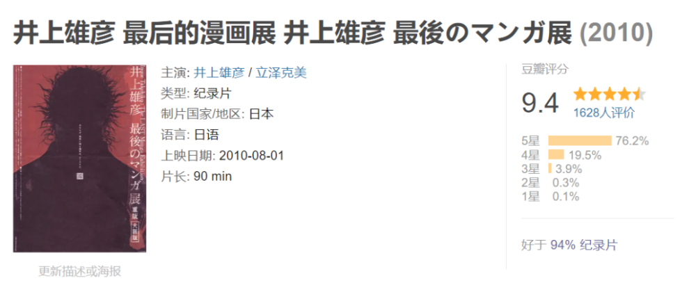 井上雄彦最后的漫画展的纪录片,期间分别在上野之森美术馆,熊本市现代美术馆,大阪天宝山三得利美术馆,仙台媒体中心举行过四次,参观总人数问32万5831人,此片熊本那次的纪录片。
