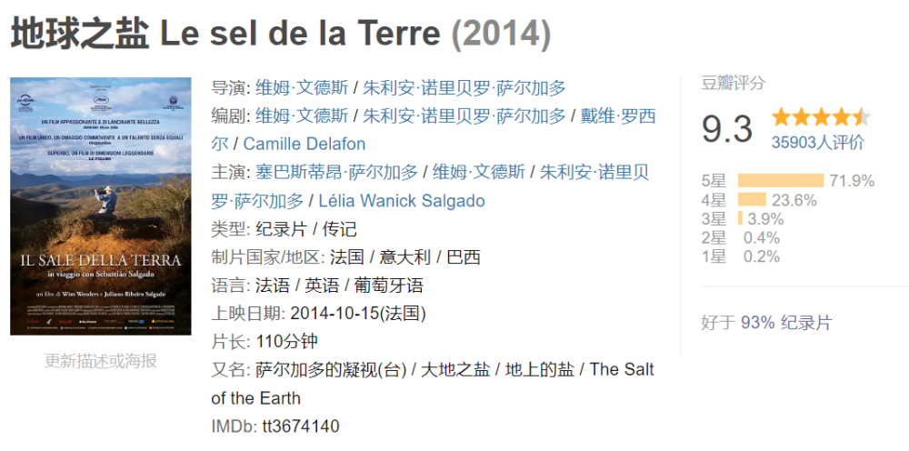 他的镜头是打开的心眼,在最细微处直视灵魂,看到巴西巨坑五万掏金者的集体面相,看到科威特油井冲天大火的真正英雄,看到非洲的死亡延续着生存。每次的拍摄方案都是经年的万里长征,是人神共舞,每次成果都引起巨大回响。合导的儿子伴着老爸远征,只见他用海象的视角,拍出但丁的地狱。再来到地球重病的现在,他重建了一座森林。云温达斯最心仪的传奇摄影师萨尔加多,就是大地之盐。获康城影展某种观点评审团特别奖,入围角逐奥斯卡最佳纪录片。