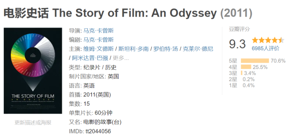 每集一小时,一共15集,长达900分钟的关于电影艺术的纪录片,制作于于2011年。这部纪录片由英国电影评论家、被称为“电影贩毒者”的马克·卡曾斯,根据自己撰写的同名著作拍摄而成,摄制期长达5年,跨越六大洲,展现了近120年的世界电影史及近千部电影作品。影片用电影化的方式讲述了电影史,探索电影人的创作如何被特定历史事件影响,而电影人之间又是怎样互相启发的。
