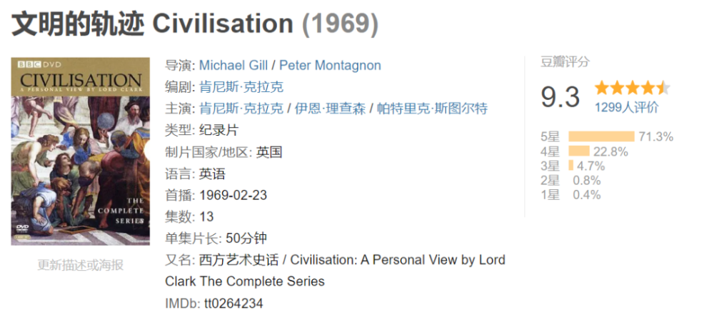 BBC“电视史上的里程碑”,当代艺术历史最具雄心壮志的纪录片拍摄工作,由著名艺术历史学家克拉克爵士担任编剧与主持,探讨西欧文明,而爵士更在本片中界定了人类文明发展中的几个重要阶段。《文明的轨迹》历时两年才拍摄完毕,剧组跨越13个国家,曾走访百多个城市拍摄,本纪录片首年播出时更被喻为电视史上的代表作。克拉克爵士引人入胜的对白,再加上欧洲地标动人画面,带领我们探索自罗马帝国沦亡至工业革命用其后的文明发展。这种通过艺术、音乐来呈现历史观点的做法,成为日后无数纪录片看齐并努力超越的基准。