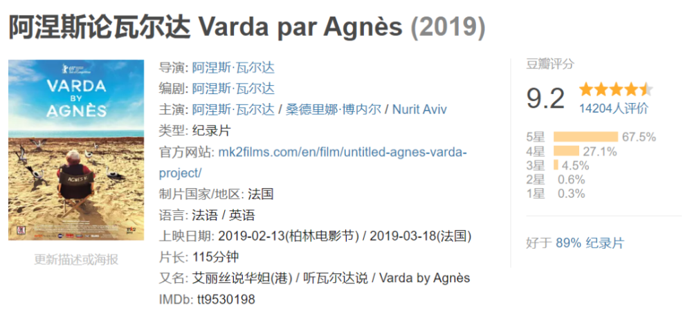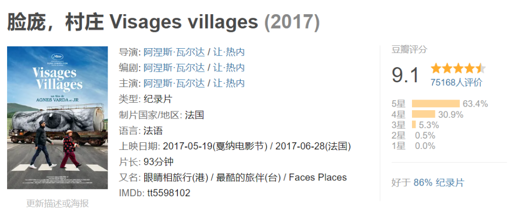 第42届多伦多国际电影节(2017)纪录片单元观众选择奖,法国新浪潮祖母阿涅斯·瓦尔达与街头艺术家JR导演,纪录片伴随两人驾驶着JR的小货车穿越法国的村庄。一路上他们拍摄下所遇到的人物,然后在房子和工厂的墙上涂抹告示牌尺寸大小的肖像画。已申报奥斯卡最佳纪录片。
