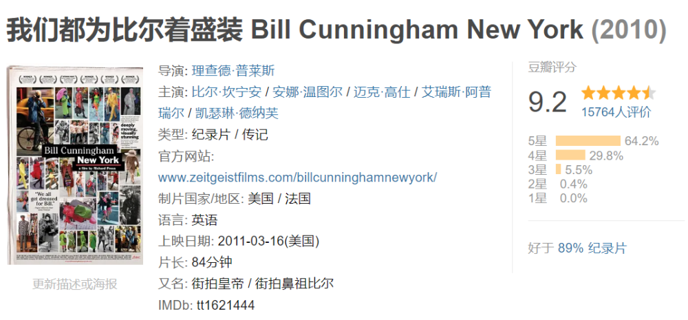 这是一部关于街拍鼻祖比尔·坎宁安(Bill Cunningham)的纪录片。已入耄耋之年的比尔依然是纽约时报的一名摄影师,拥有自己的板面专栏“On the Street”以及“Evening Hours”。他从六十年代起便一直沉迷街拍,并享受工作。在比尔的镜头下,不管你是上流名人、普通工人甚至是下城居民,只要你着装出位有个性,比尔都乐于捕捉你的美。几乎所有的时尚界人士都认识并尊重这位摄影顽童,就连著名时尚杂志Vogue的女主编安娜·温图尔(Anna Wintour)也说:“我们都为比尔着盛装。”然而,这样一位几乎把一生都献给了时尚且功不可没的老人,依然住在狭小工作室里,每天骑着自行车上街拍照,不过老人家却觉得这样最好,对他来说,拍照以外的任何事都无关紧要,能够自由地捕捉新鲜,才是他的追求。