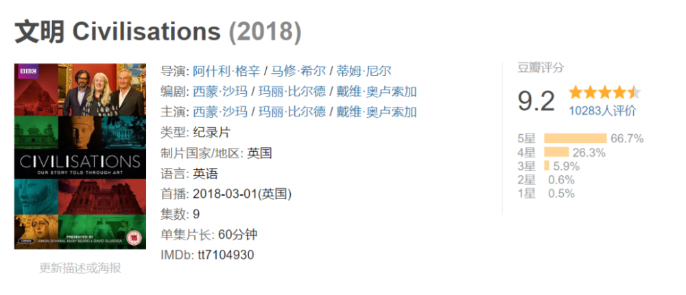 BBC新版《文明》,2018倾情奉献,共九集。涵盖六个大陆,三十一个国家,超过五百件艺术品。主讲人历史学家西蒙·沙玛、学者玛丽·比尔德以及戴维·奥卢索加将一起探索人类创造的渴望。此外,“文明节”将通过创新的数字产品和活动,为博物馆的珍宝赋予新的生命力。
