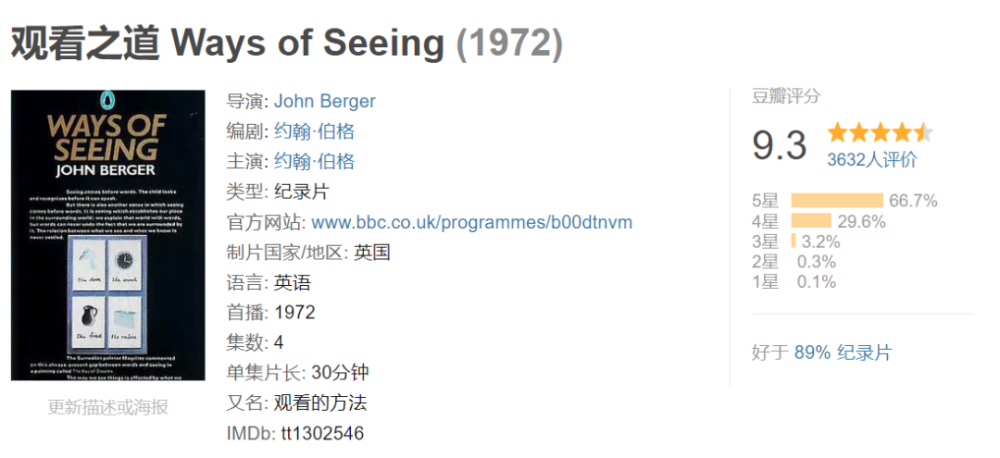 《 Ways of Seeing》是1972年由作家约翰·伯格(John Berger)和制片人麦克·狄伯(Mike Dibb)创作的一部30分钟的电视连续剧。它于1972年1月在BBC二台播出,并被改编成同名书籍。