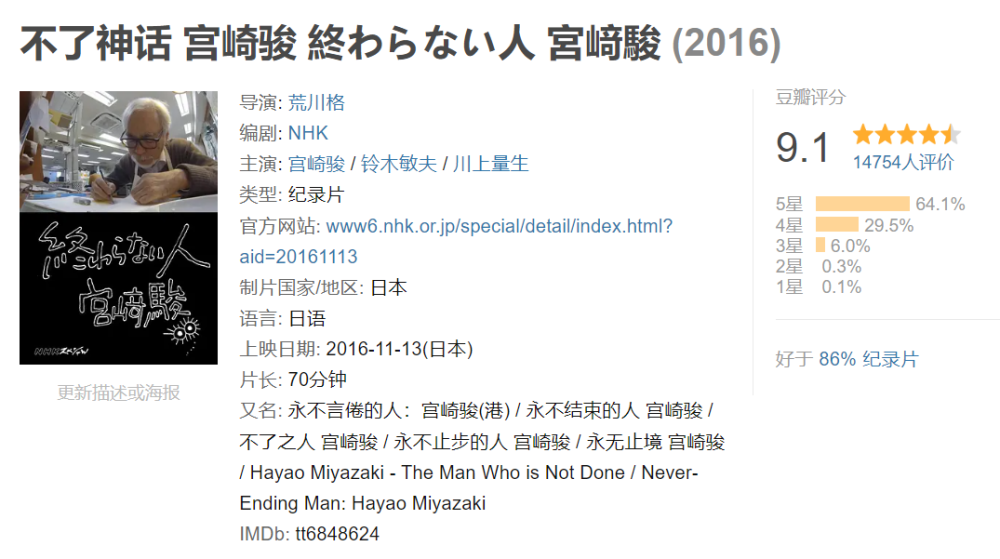 宫崎骏是由荒川格执导的2016年日本电视纪录片。这部电影是在奥斯卡获奖动画师兼电影制作人宫崎骏决定退休之后拍摄的,其中包括记录了他2018年的短片《毛毛虫波罗》(Boro the Caterpillar)的早期制作。